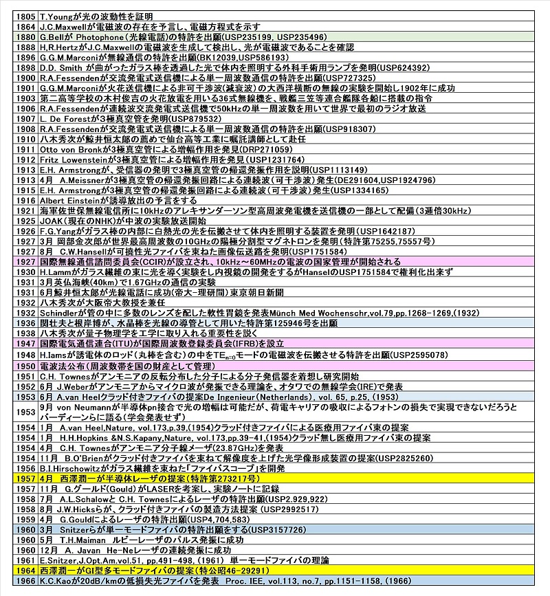 かくして八木一門により、可干渉光を用いた光通信の三要素のすべてが1950年~1964年の間に発明されたが、三要素のいずれにも西澤先生が関与している。