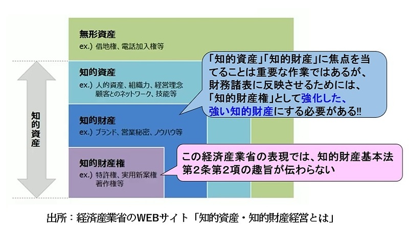 確かに知的財産権は、知的財産に含まれる下位概念ではあるが、知的財産権と知的財産では財務諸表に反映する効果や力が異なる。