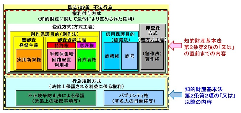 知的財産基本法の2年後となる、2004年に民法が改正され、民法第709条には、故意又は過失によって他人の権利又は法律上保護される利益を侵害した者は、これによって生じた損害を賠償する責任を負うと、「法律上保護される利益」が明記された。特許法等の権利付与方式の知的財産権は、民法第709条の特則として位置ずけられている。