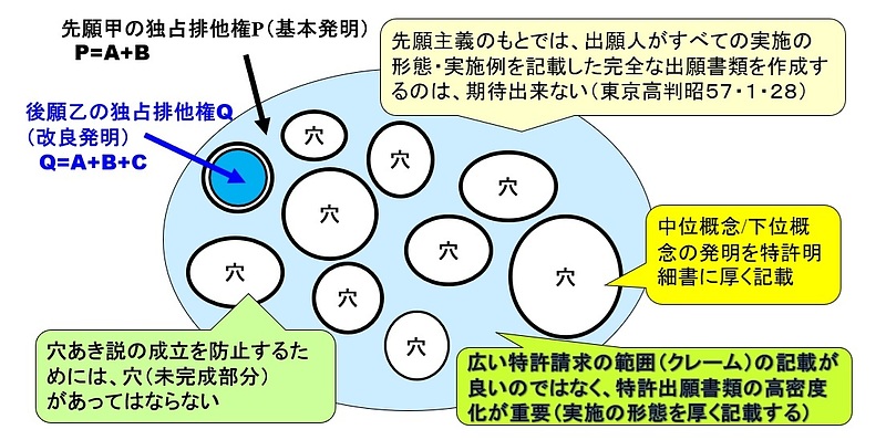 専用権説の場合においても、図3に示すような穴空き説によれば、先願甲社は後願乙者の特許発明Qを自由に実施できない。穴空き説は、先願特許発明Pの特許権には元々穴が空いているのだから、先願特許発明Pと後願特許発明Qは別発明であり、利用関係がないという主張であるので、乙社は甲社から実施許諾を得なくても、後願特許発明Qを実施可能となる。