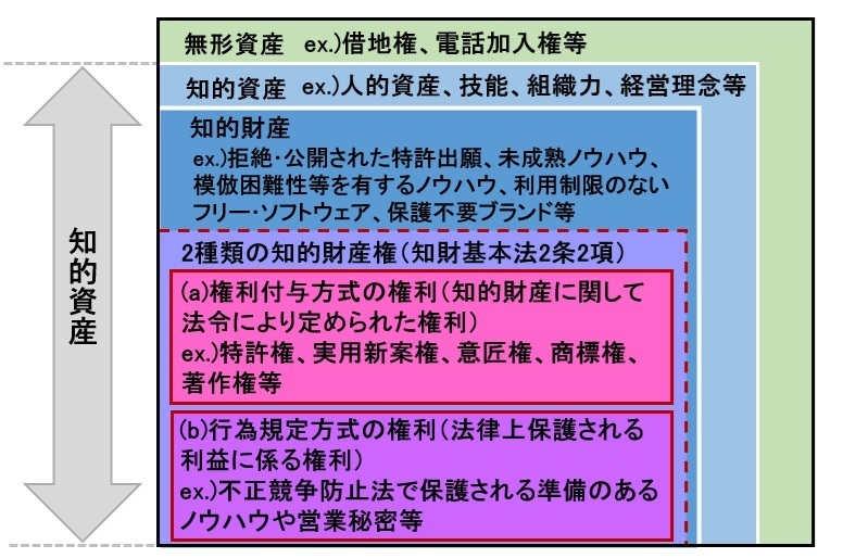 図1に引用した大きさの異なる4つの矩形を重ねたダイアグラムからは「知的財産権」とは特許権、実用新案権、育成者権、意匠権、著作権、商標権等であり、「知的財産」とは特許権、実用新案権、著作権等以外のブランド、営業秘密、ノウハウ等であるかのようなイメージを受ける恐れがあるが、このイメージは正しくない。