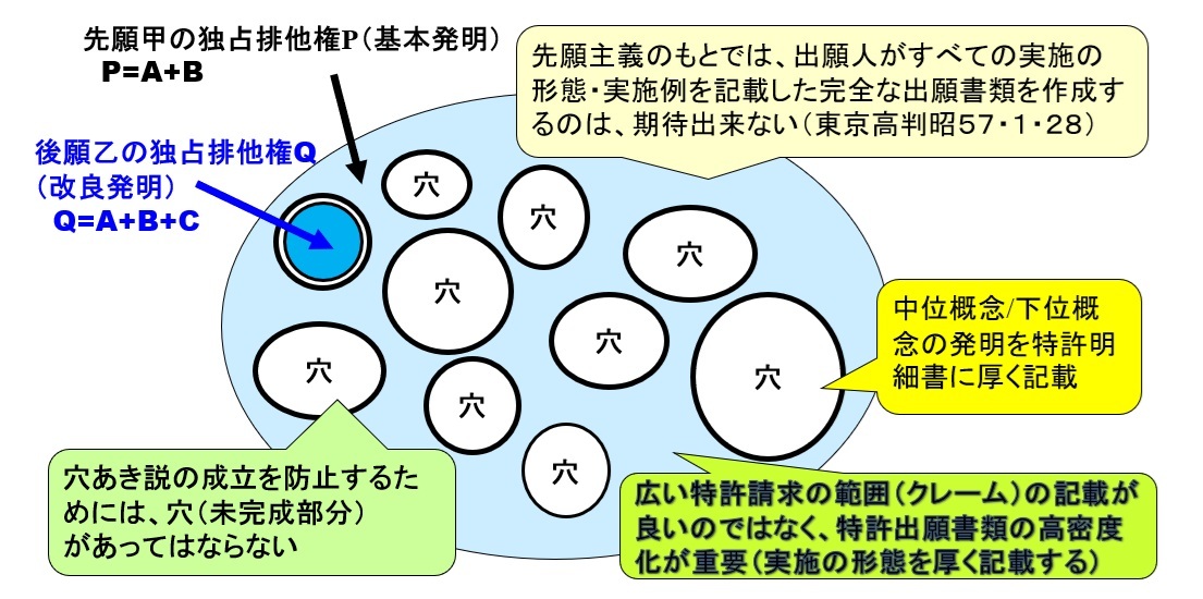 専用権説の場合においても、図3に示すような穴空き説によれば、先願甲社は後願乙者の特許発明Qを自由に実施できない。穴空き説は、先願特許発明Pの特許権には元々穴が空いているのだから、先願特許発明Pと後願特許発明Qは別発明であり、利用関係がないという主張であるので、乙社は甲社から実施許諾を得なくても、後願特許発明Qを実施可能となる。