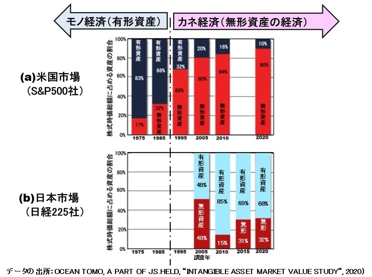 有形資産重視のノルム(社会通念)が、「失われた30年」を導いたと言われる所以である。図1(a)及び(b)のデータは