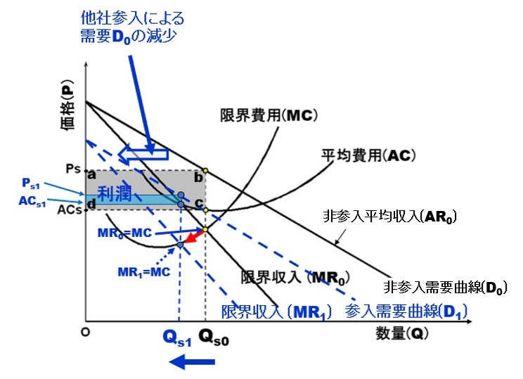 よって、他社が独占的競争市場に参入した場合の、商品Xの販売数量Q<sub>s1のときの参入価格P<sub>s1、販売数量Q<sub>s1のときの平均費用AC<sub>s1とすると、企業甲の利潤Π<sub>1は、