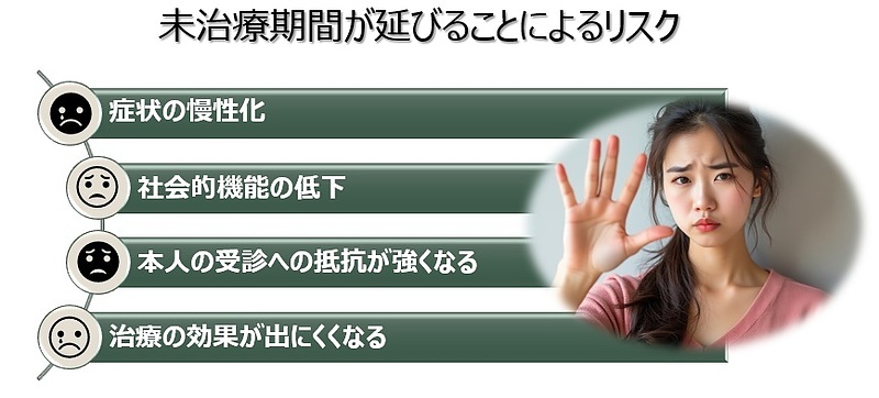 特に統合失調症やうつ病のような疾患では、発症から治療開始までの期間が短いほど予後(回復の見込み)が良いことが研究で明らかになっています。