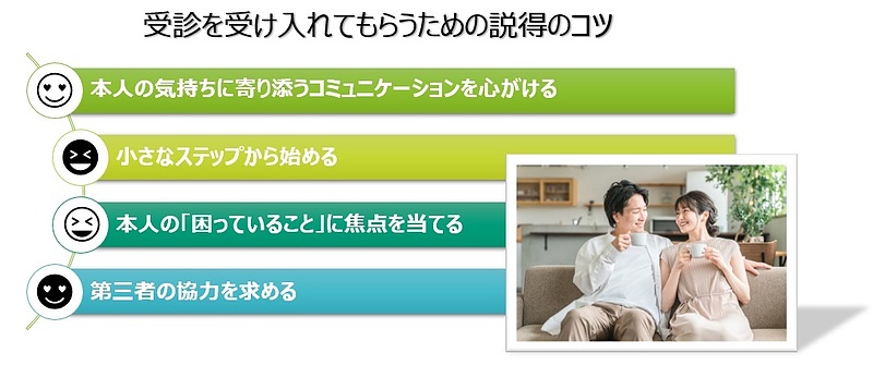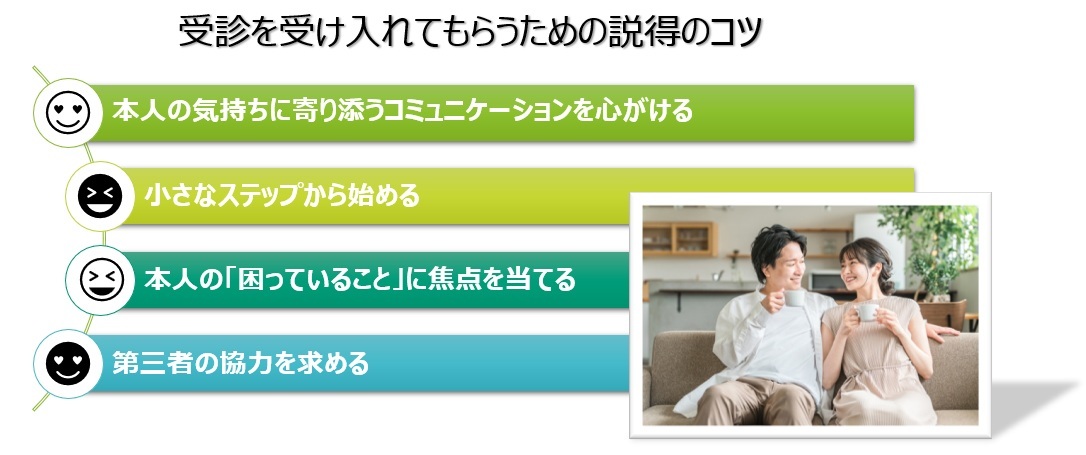 この場合、病気そのものを説得の材料にするのではなく、今本人が困っていることに焦点を当てて伝える方法が効果的です。