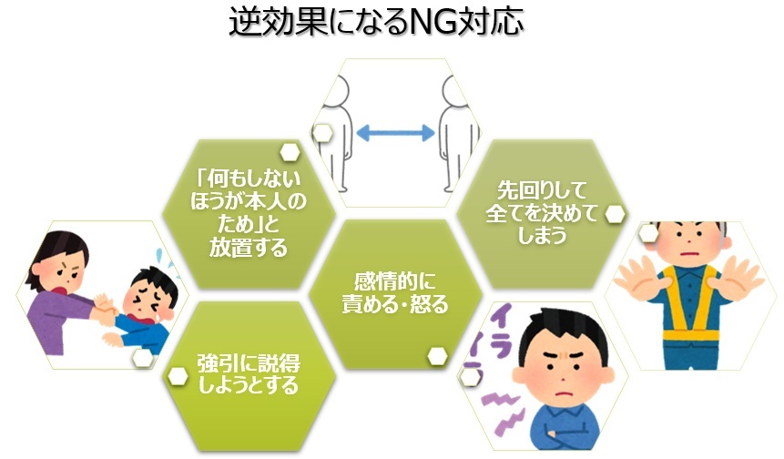 本人の拒否反応を強めてしまう対応をしてしまうと、説得のハードルがさらに上がり、家族関係にも悪影響を及ぼしてしまいます。