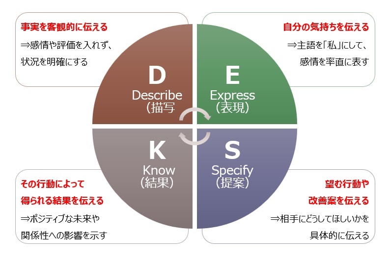 4つのステップで構成されていて、感情的にならず、冷静かつ誠実に自分の立場を伝えることができます。
