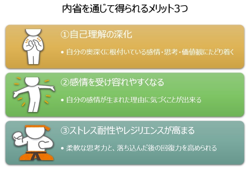 これらに対して内省を行うことで、相反する心情や状況によるストレスを緩和し、落ち込んだ時の回復力(レジリエンス)を高めることが出来ます。