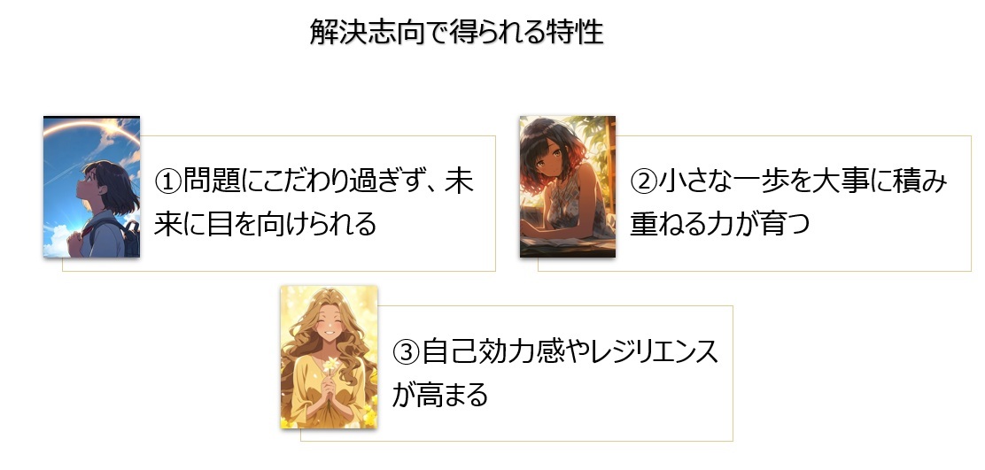 つまり、自分軸があることで「自分らしい方向性」がブレず、解決志向があることで「前に進む力」が育ちます。