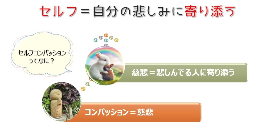 「慈悲」とは、悲しい思いをしている人にそっと寄り添うことです。それを「セルフ」自分に対して行うことが「セルフコンパッション」です。
