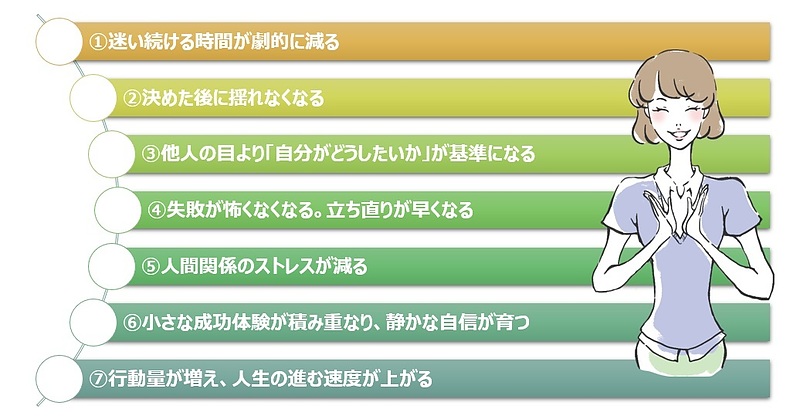 迷って迷って、頭の中でシミュレーションを繰り返し、疲れ果てる、といったことが減り、5分あれば方向性が決まるようになります。