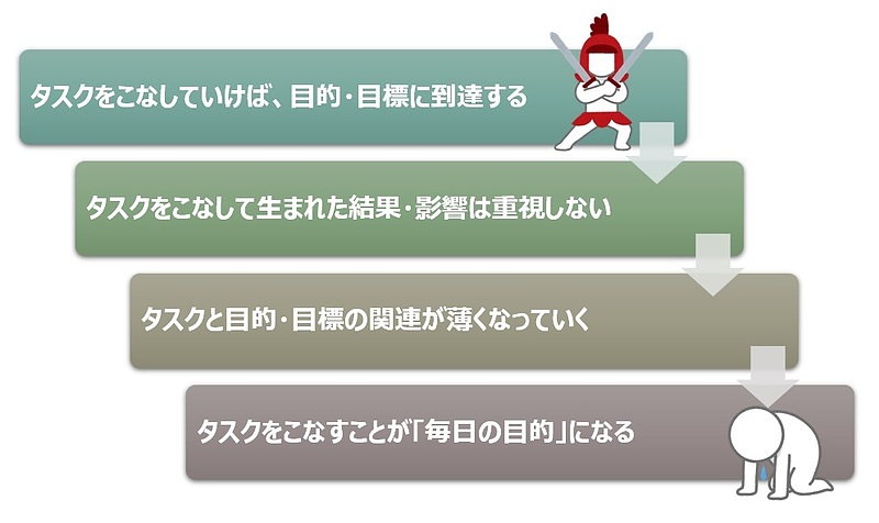 日々のタスクを必要な分こなすのは、目的地までの道を○メートル進む、みたいなものであるはずだったのに、タスクをこなす=あなたの目標達成になっている。