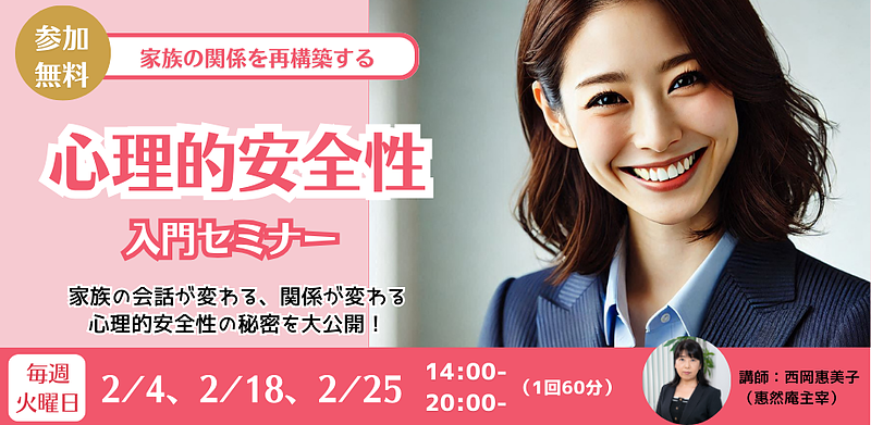 このセミナーでは、今注目されている「心理的安全性」の概念を家庭に応用し、より温かく、信頼感に満ちた家庭環境を作るための具体的な方法をお伝えします。