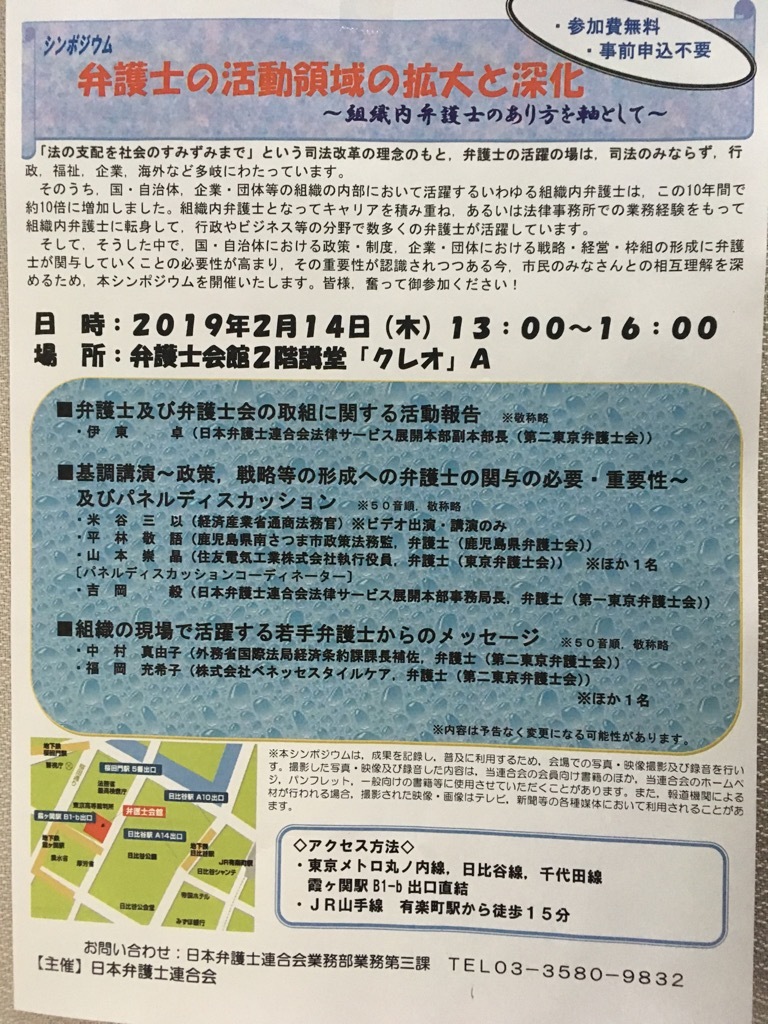 本日は,私が所属しております千葉県弁護士会が主催する『弁護士の活動領域の拡大と深化~組織内弁護士のあり方を軸として~』のご案内です。