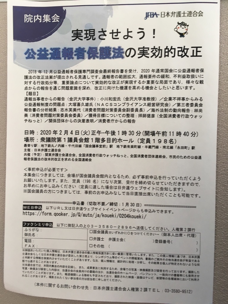 本日は,私が所属しております日本弁護士連合会が主催する院内集会『実現させよう! 公益通報者保護法の実効的改正』のご案内です。