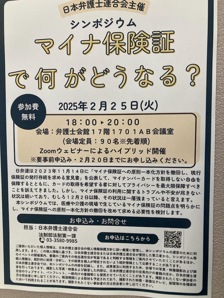 本日は,私が所属しております日本弁護士連合会が主催するシンポジウム『マイナ保険証で何がどうなる?(シンポジウム)』のご案内です。
