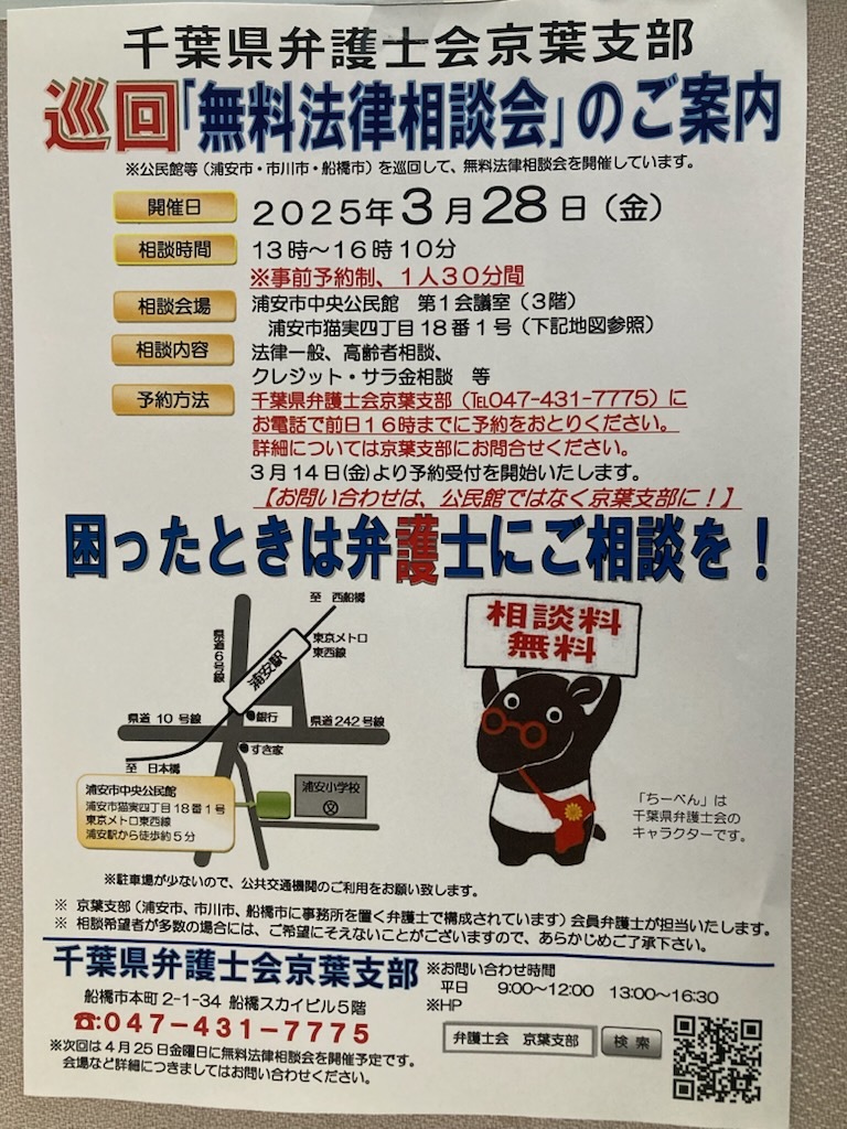 本日は,私が所属しております千葉県弁護士会京葉支部が主催する『無料法律相談会』のご案内です。