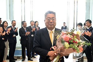 3期目をスタートした浦安市長は,花束と盛大な拍手で迎えられました。