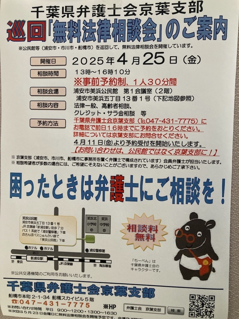 本日は,私が所属しております千葉県弁護士会京葉支部が主催する『無料法律相談会』のご案内です。