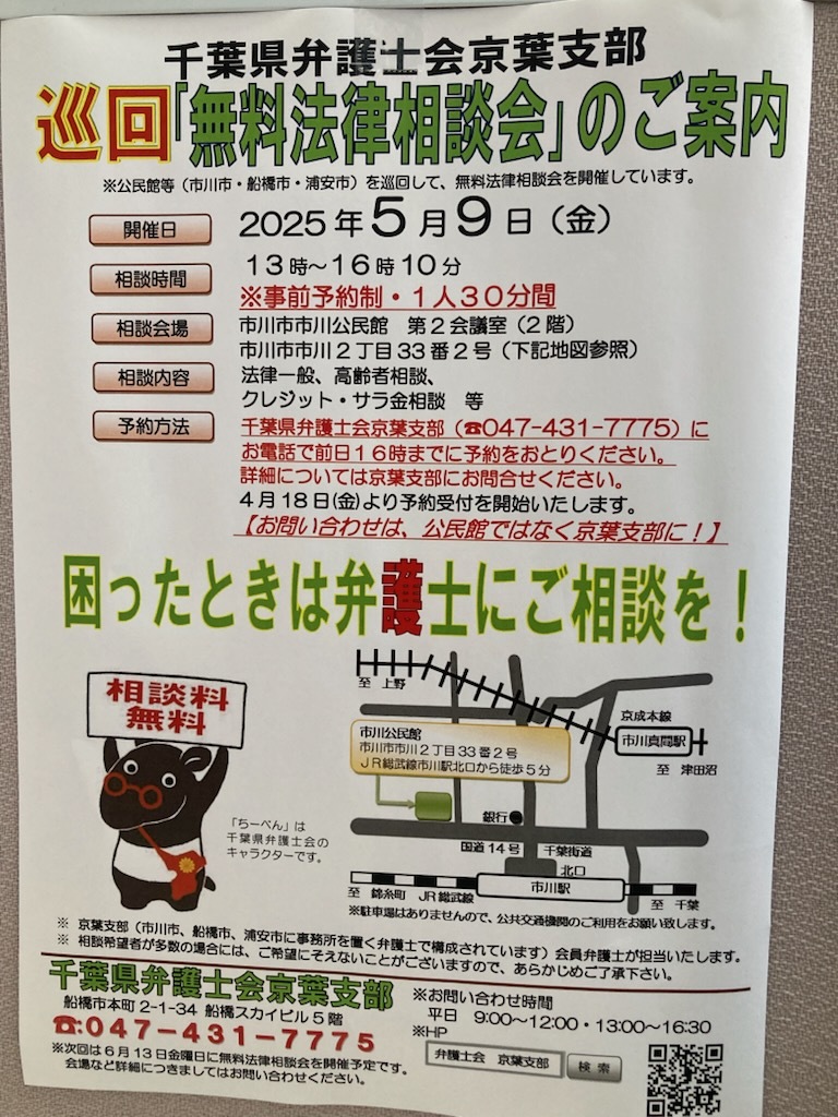 本日は,私が所属しております千葉県弁護士会京葉支部が主催する『無料法律相談会』のご案内です。