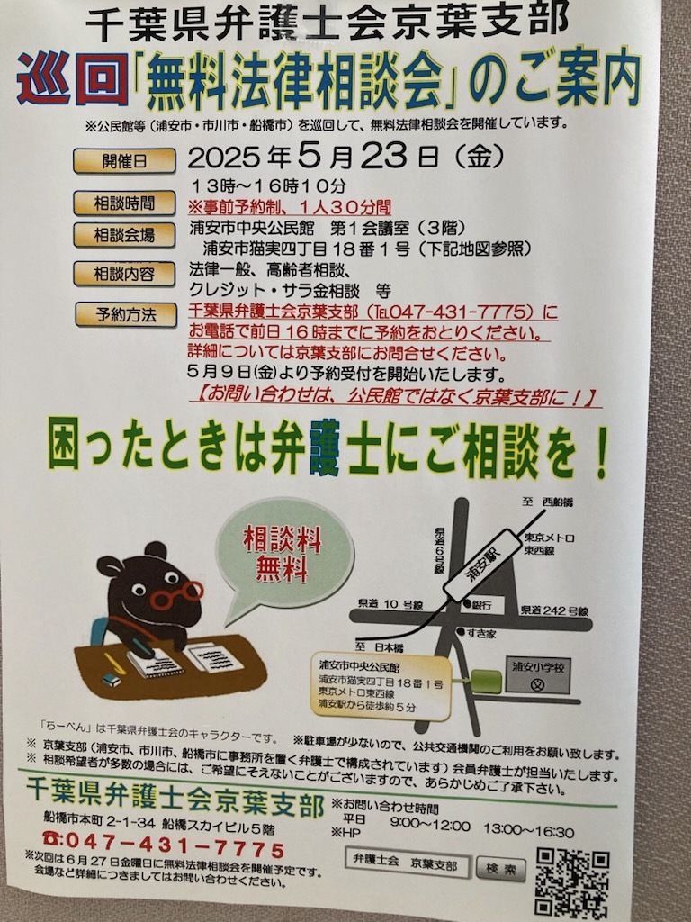 本日は,私が所属しております千葉県弁護士会京葉支部が主催する『無料法律相談会』のご案内です。