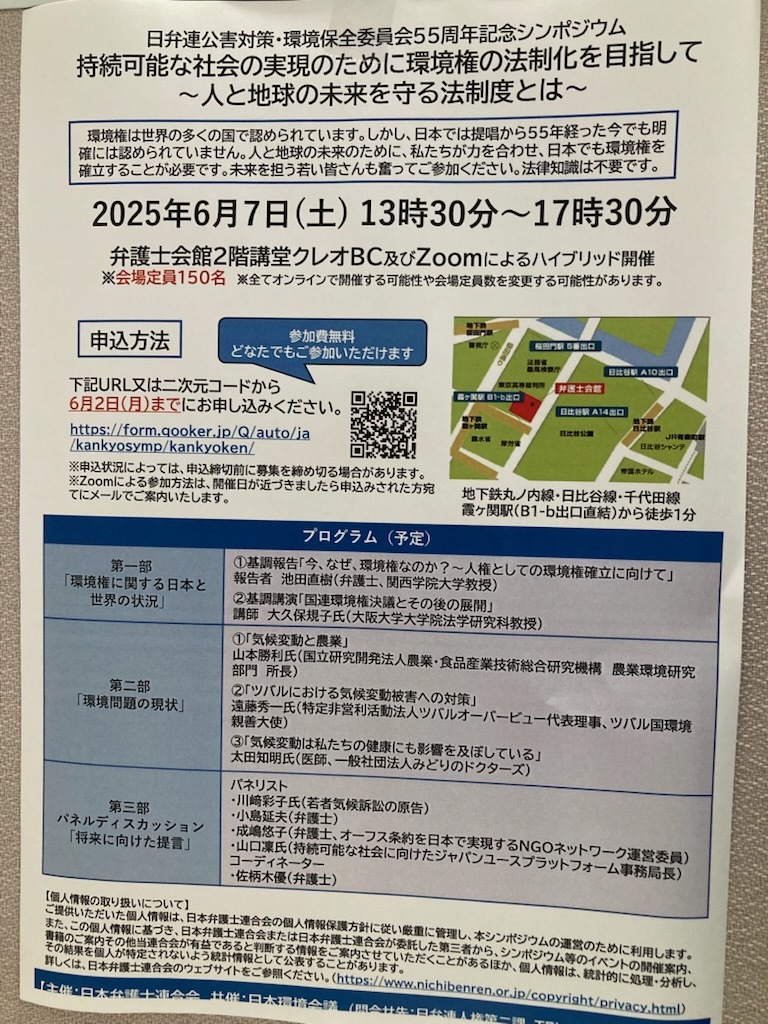 本日は,私が所属しております日本弁護士連合会が主催するシンポジウム『持続可能な社会の実現のために環境権の法制化を目指して~人と地球の未来を守る法制度とは~』のご案内です。