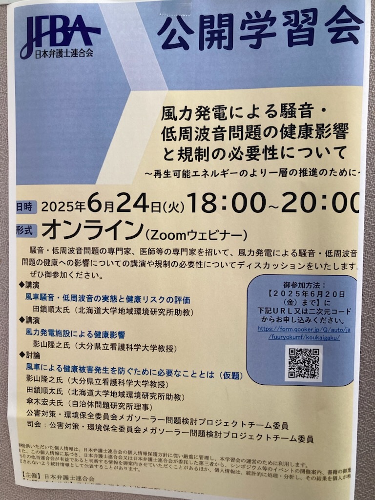 本日は,私が所属しております日本弁護士連合会が主催する公開学習会『風力発電による騒音・低周波音問題の健康影響と規制の必要性について~再生可能エネルギーのより一層の推進のために~』のご案内です。