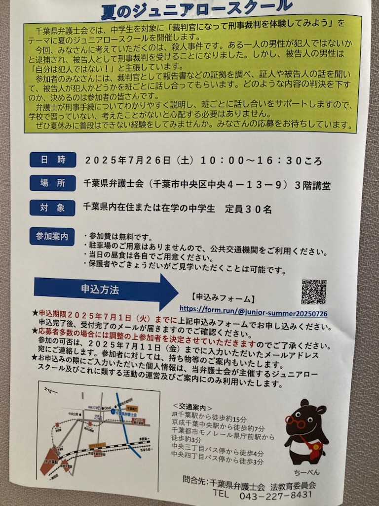 本日は,私が所属しております千葉県弁護士会が共催する『夏のジュニアロースクール』のご案内です。