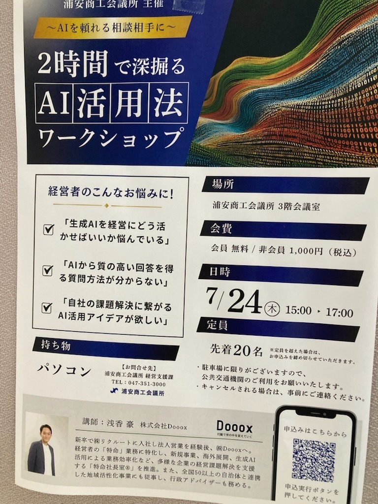 本日は,私が所属しております浦安商工会議所が主催するワークショップ『AIを頼れる相談相手に!2時間で深掘りする生成AI活用法』のご案内です。