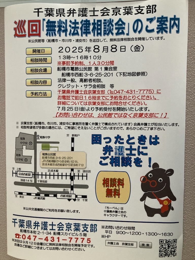 本日は,私が所属しております千葉県弁護士会京葉支部が主催する『無料法律相談会』のご案内です。