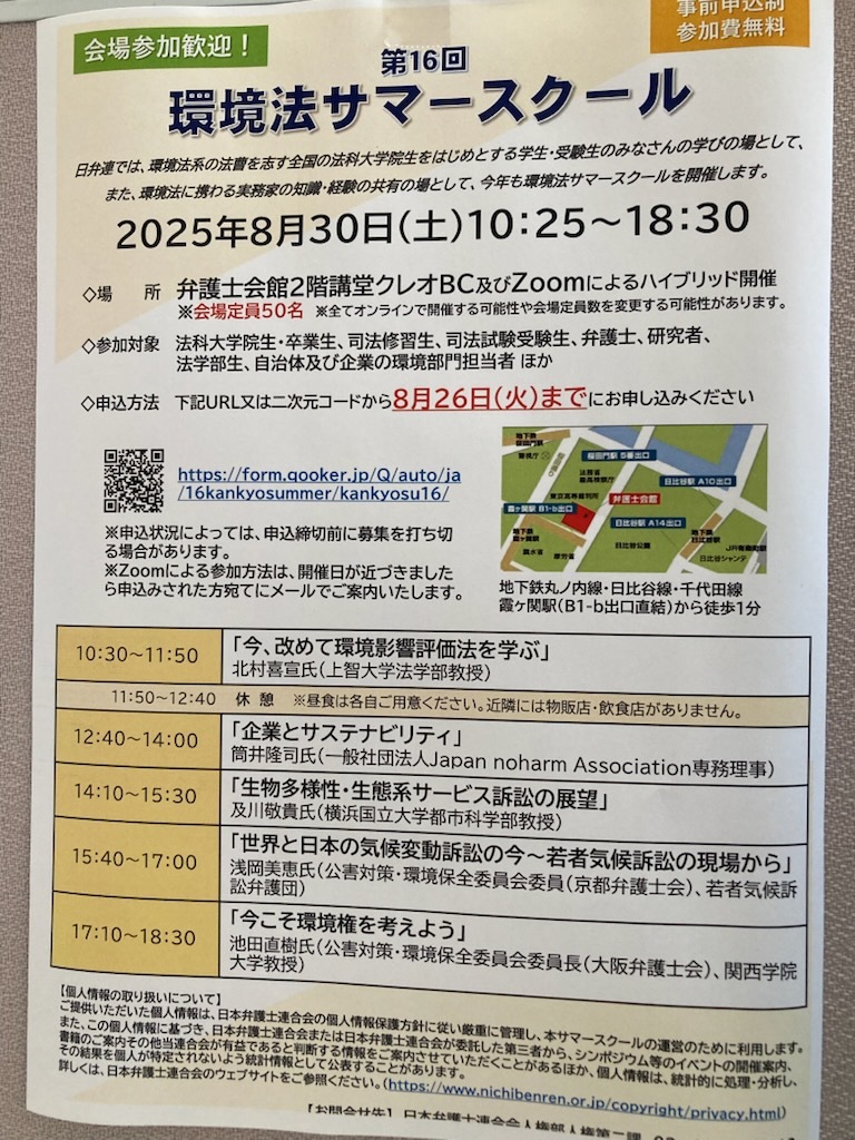 本日は,私が所属しております日本弁護士連合会が主催する『環境法サマースクール』のご案内です。