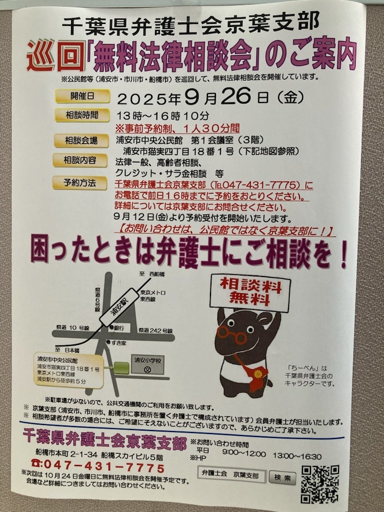千葉県弁護士会京葉支部では,「弁護士による無料法律相談会」を実施いたしますので,お気軽にご相談ください。
