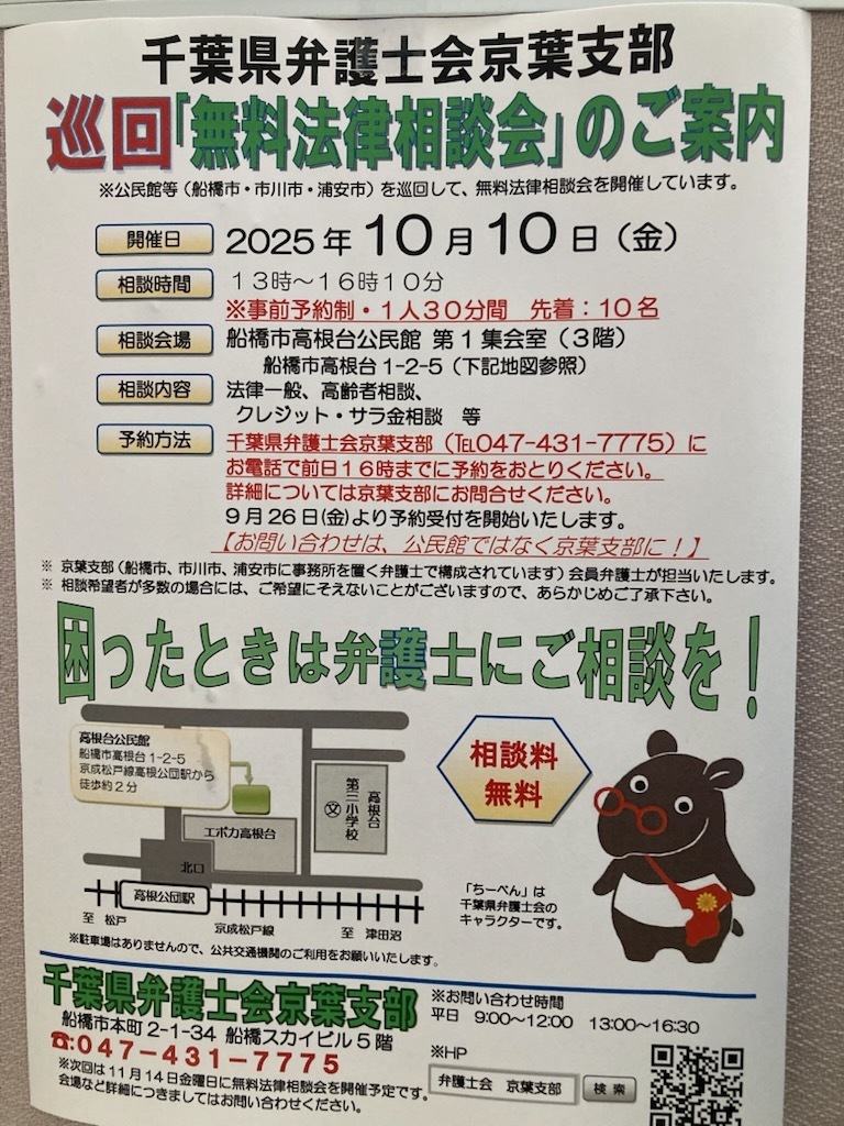 本日は,私が所属しております千葉県弁護士会京葉支部が主催する『無料法律相談会』のご案内です。