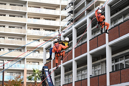 今回の新たな訓練としては,大型バスに住民を誘導し避難させる一斉避難行動訓練,座屈したビルからの救出,蹴破り戸を活用した避難などがあり,参加者は真剣に取り組んでいました。