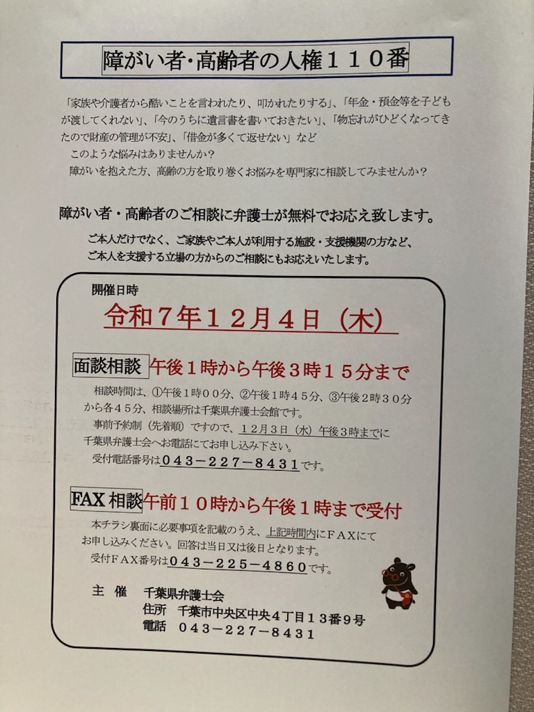 本日は,私が所属しております千葉県弁護士会が主催する『障がい者・高齢者の人権110番』のご案内です。