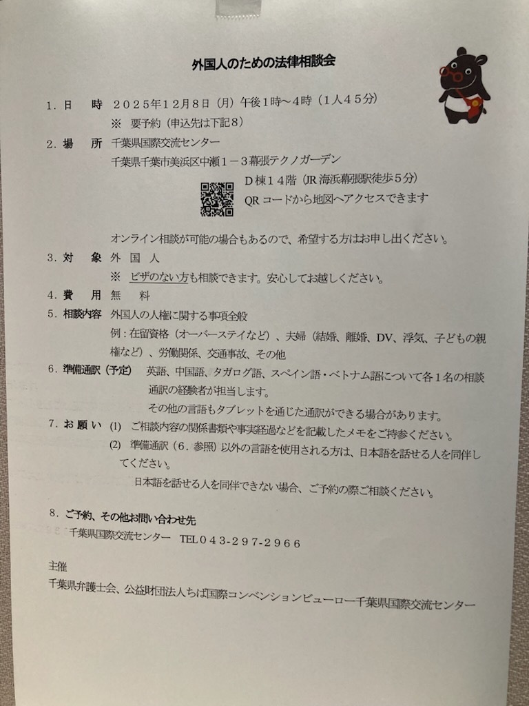 本日は,私が所属しております千葉県弁護士会が共催する『外国人のための法律相談会』のご案内です。