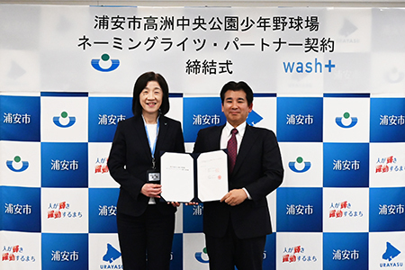 今回,高洲中央公園少年野球場のパートナーとして,人と環境にやさしい洗浄技術のコインランドリーを運営する株式会社wash-plus(ウォッシュプラス)と契約を締結することとなりました。