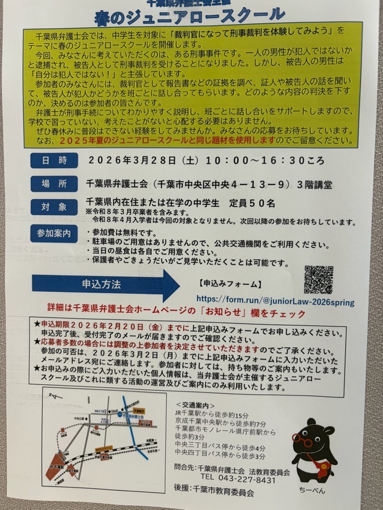 本日は,私が所属しております千葉県弁護士会が主催する『春のジュニアロースクール』のご案内です。
