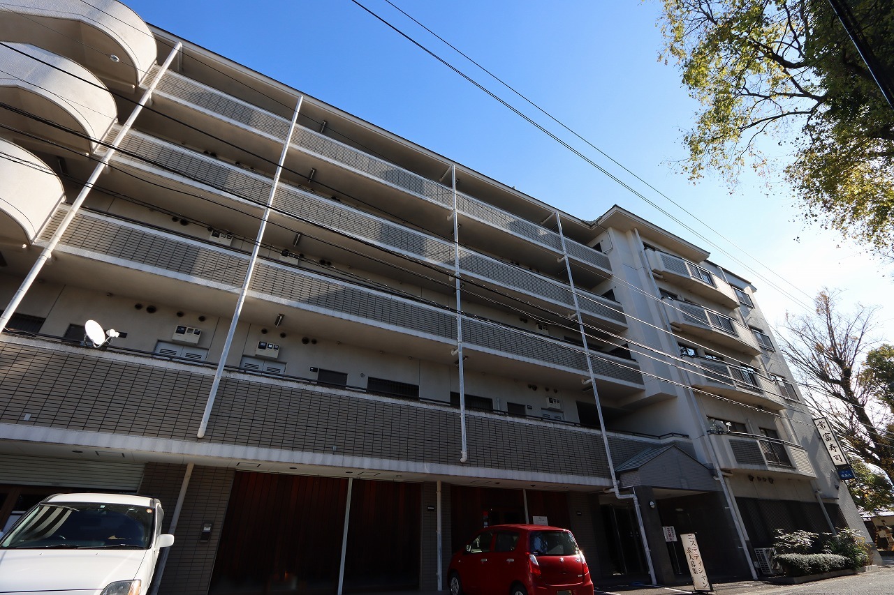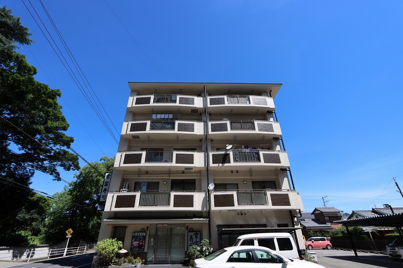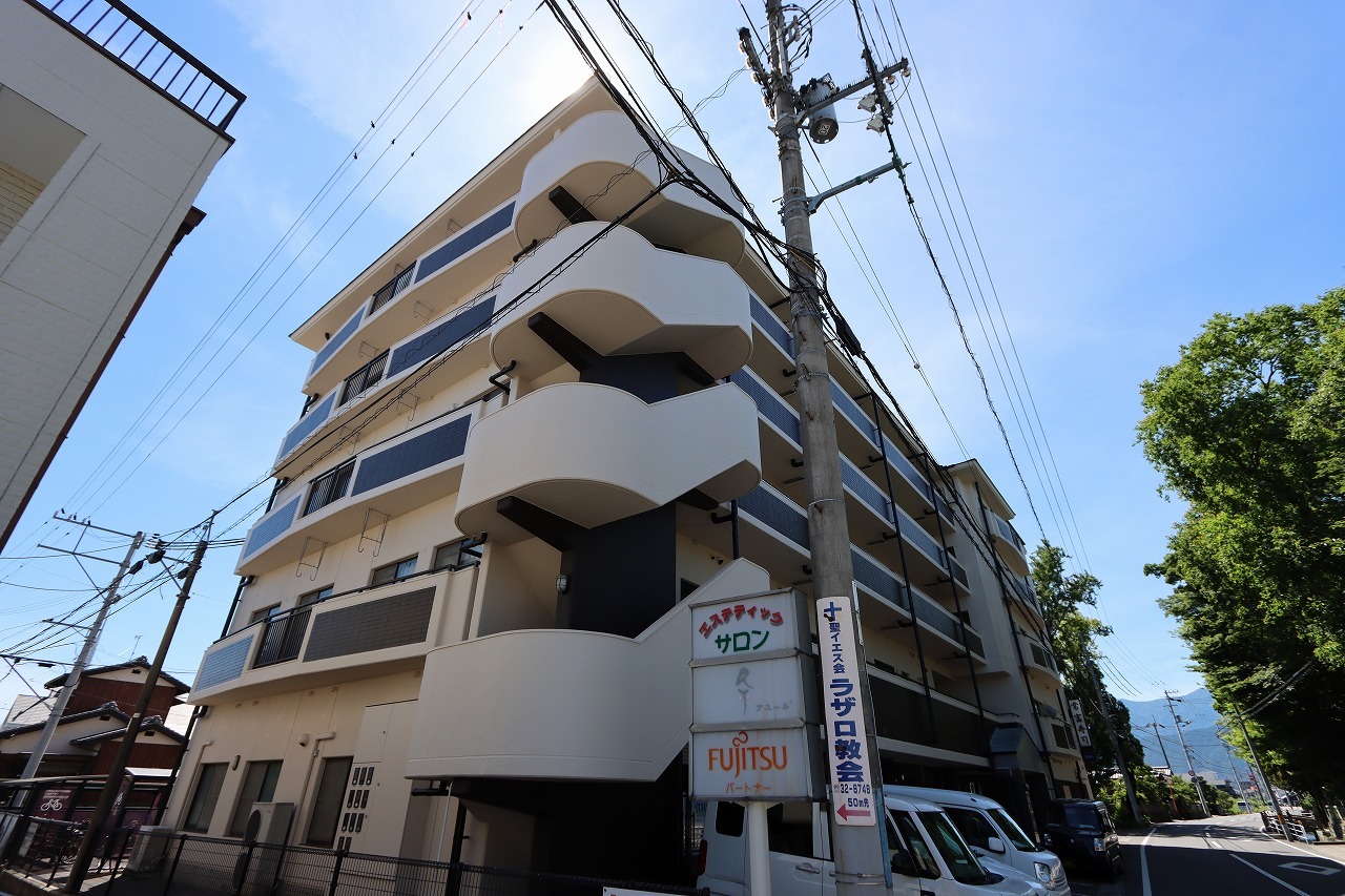 バルコニー面をキリッと引き締める配色で、遠目にも印象が立つ『物件の顔』をつくっています。