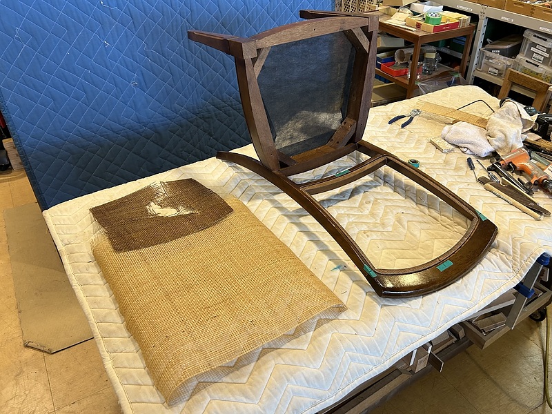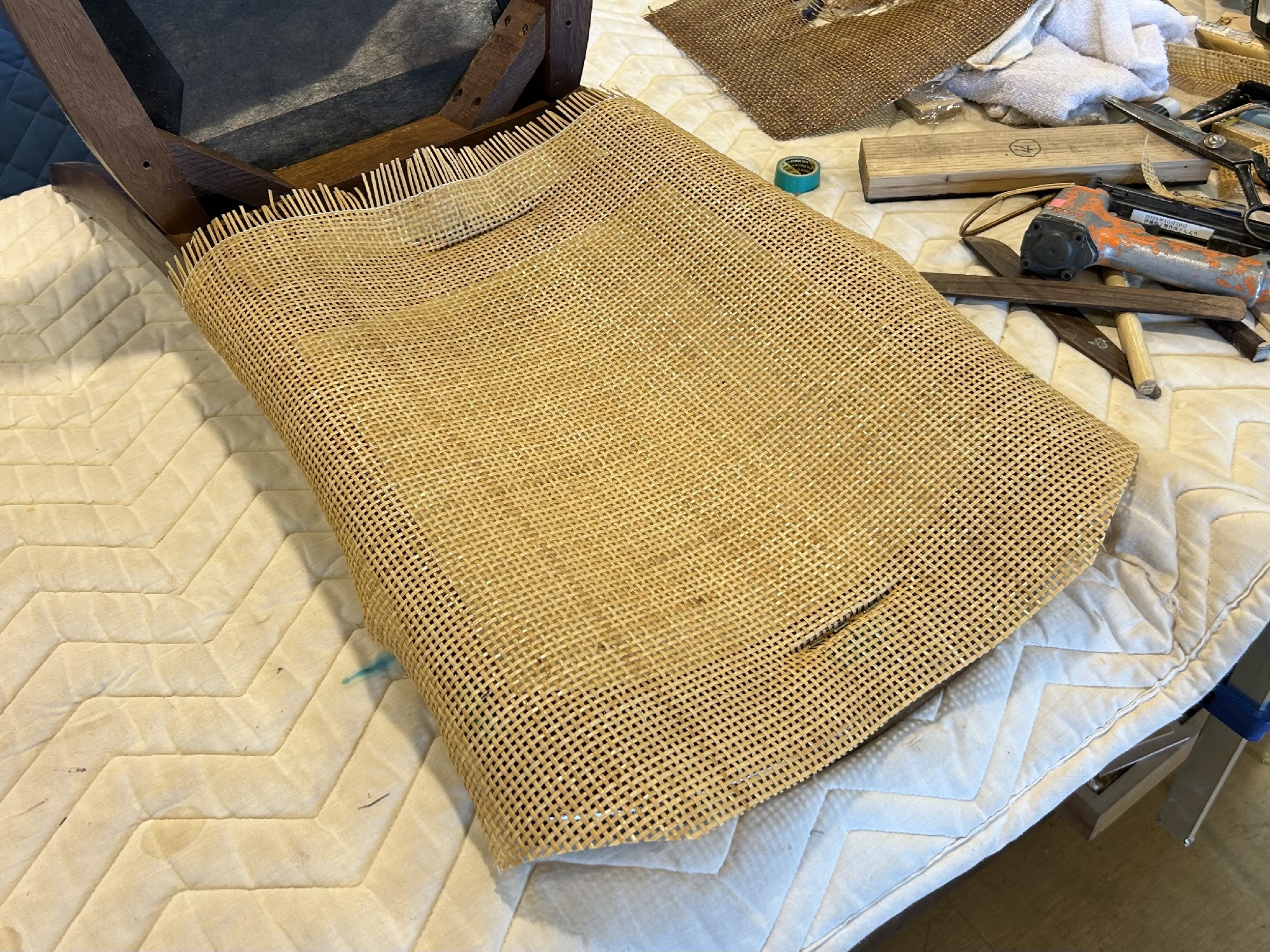 修理作業中①/やぶれた籐シートの剥ぎ取り+新しい籐シートの準備