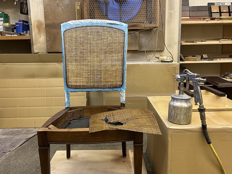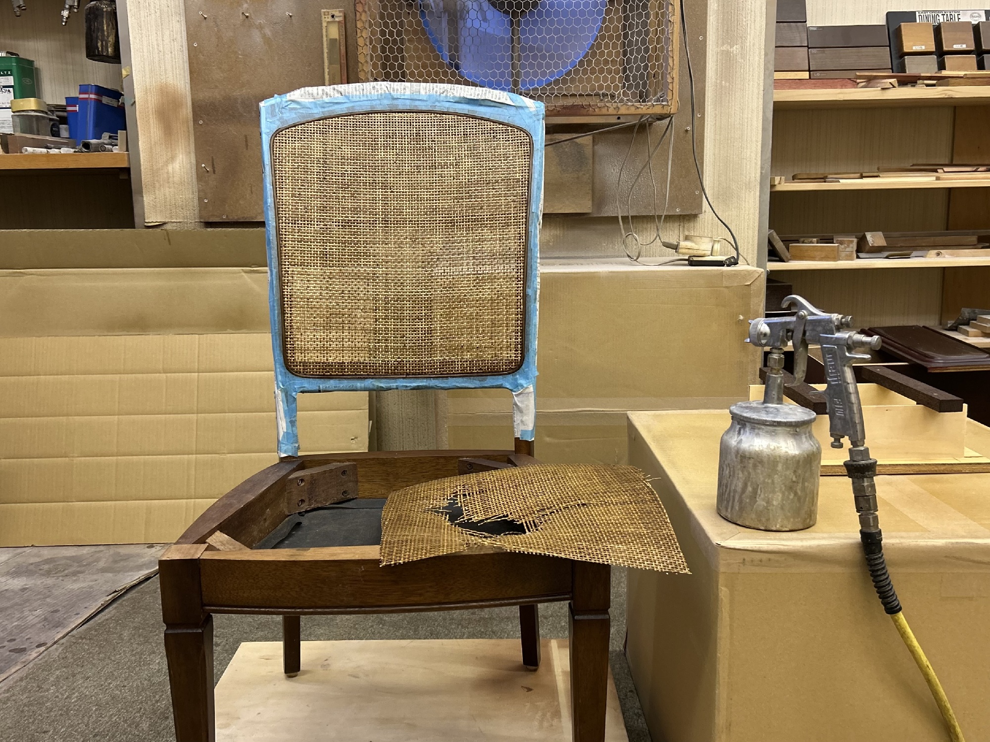 籐の張り替え作業で、最後の工程はウレタン塗装作業です。