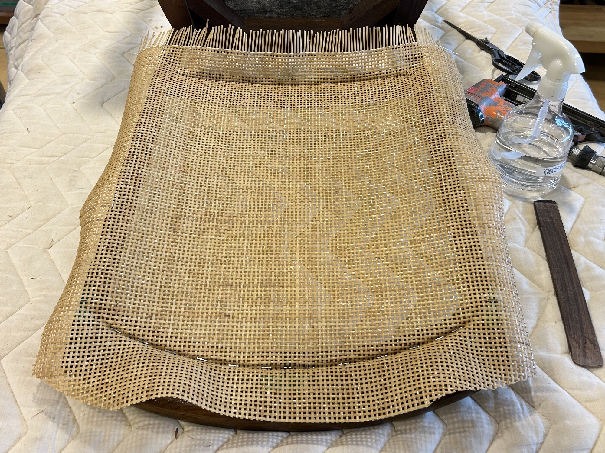 三次曲面の背もたれに新しい籐シートを、なるべく水平かつ左右対称に張り込んでいくためには慎重作業が必要です。