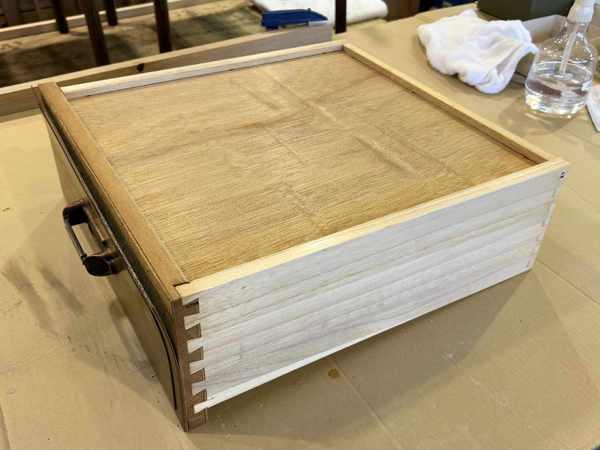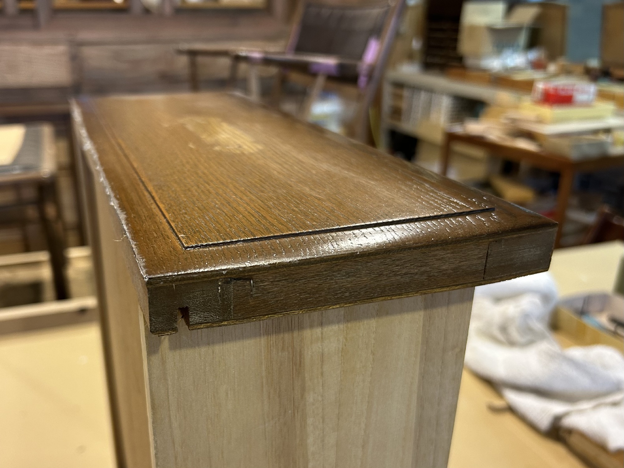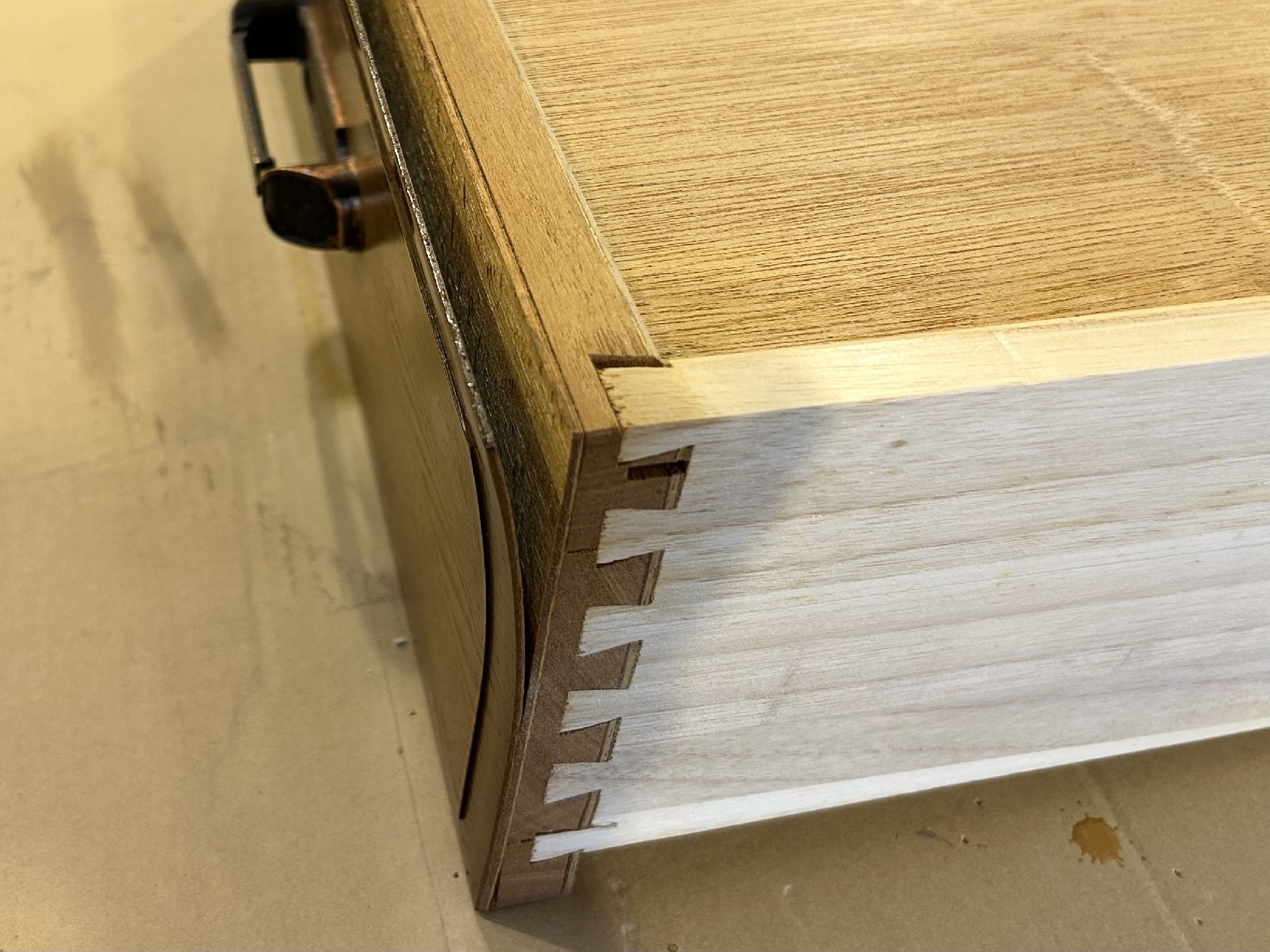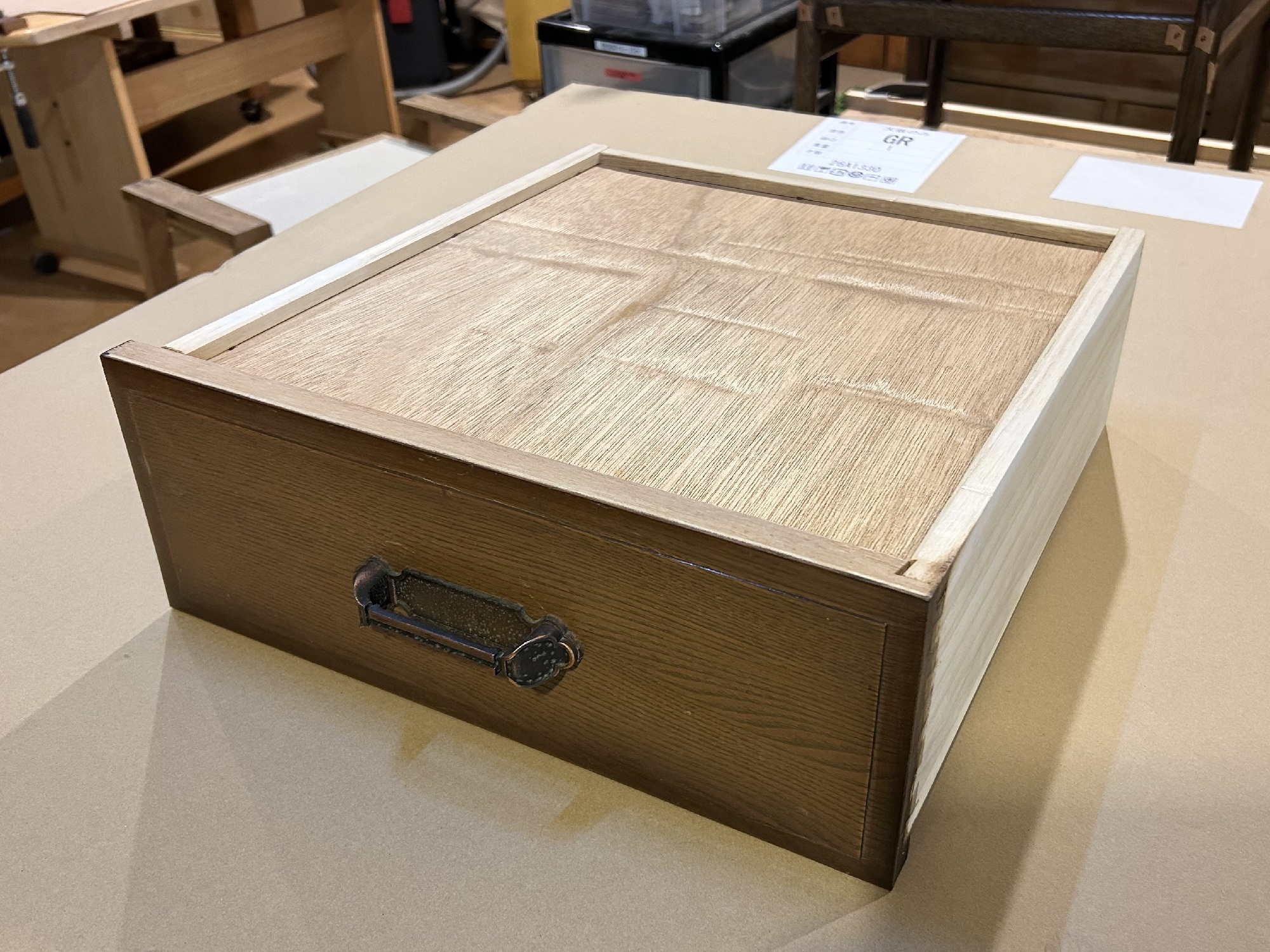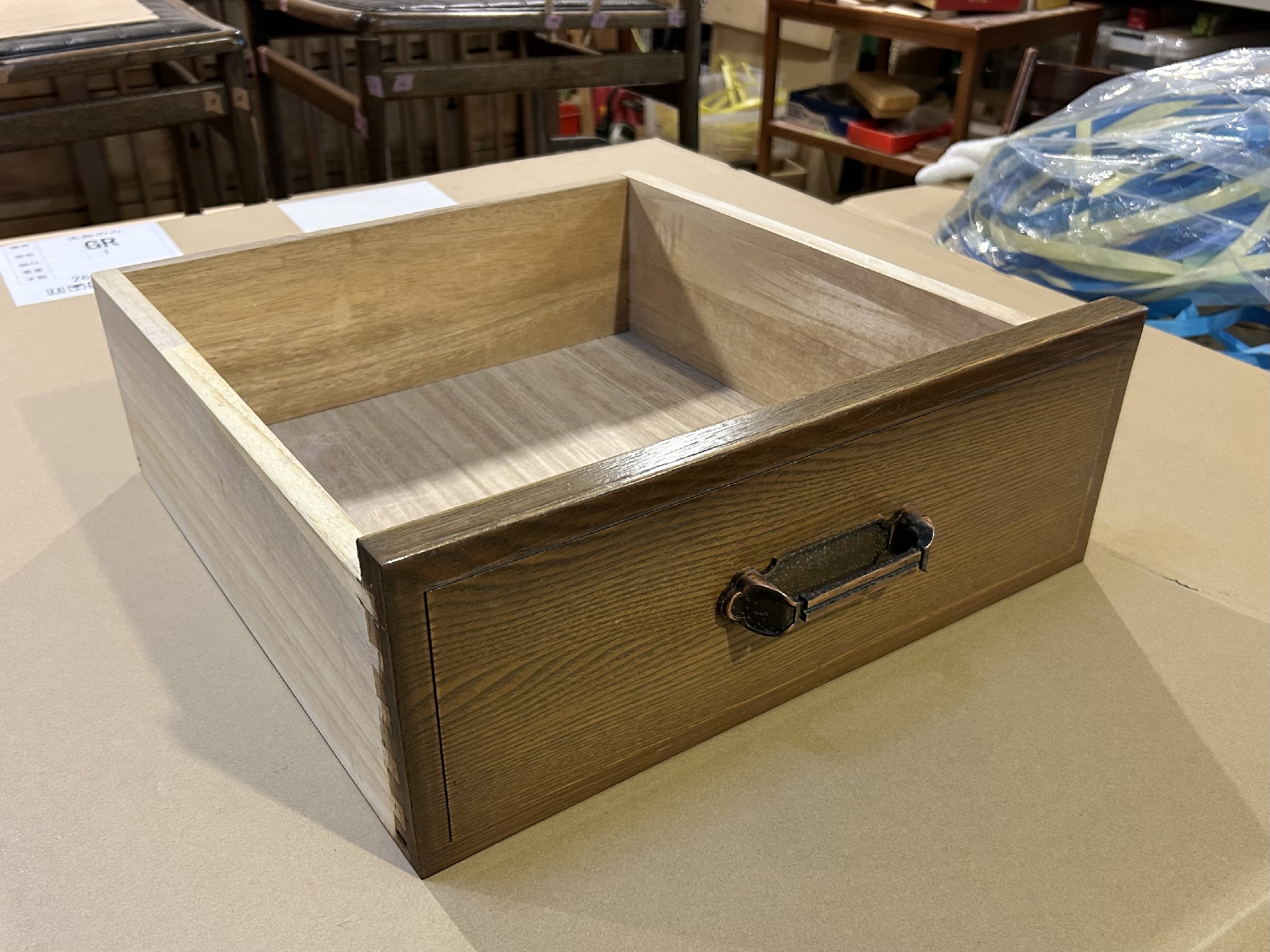 昔の引き出しは、前板と側板の接合は 『アリ組み』、側板と向う板の接合は 『あられ組』で、基本に忠実な組み方です。