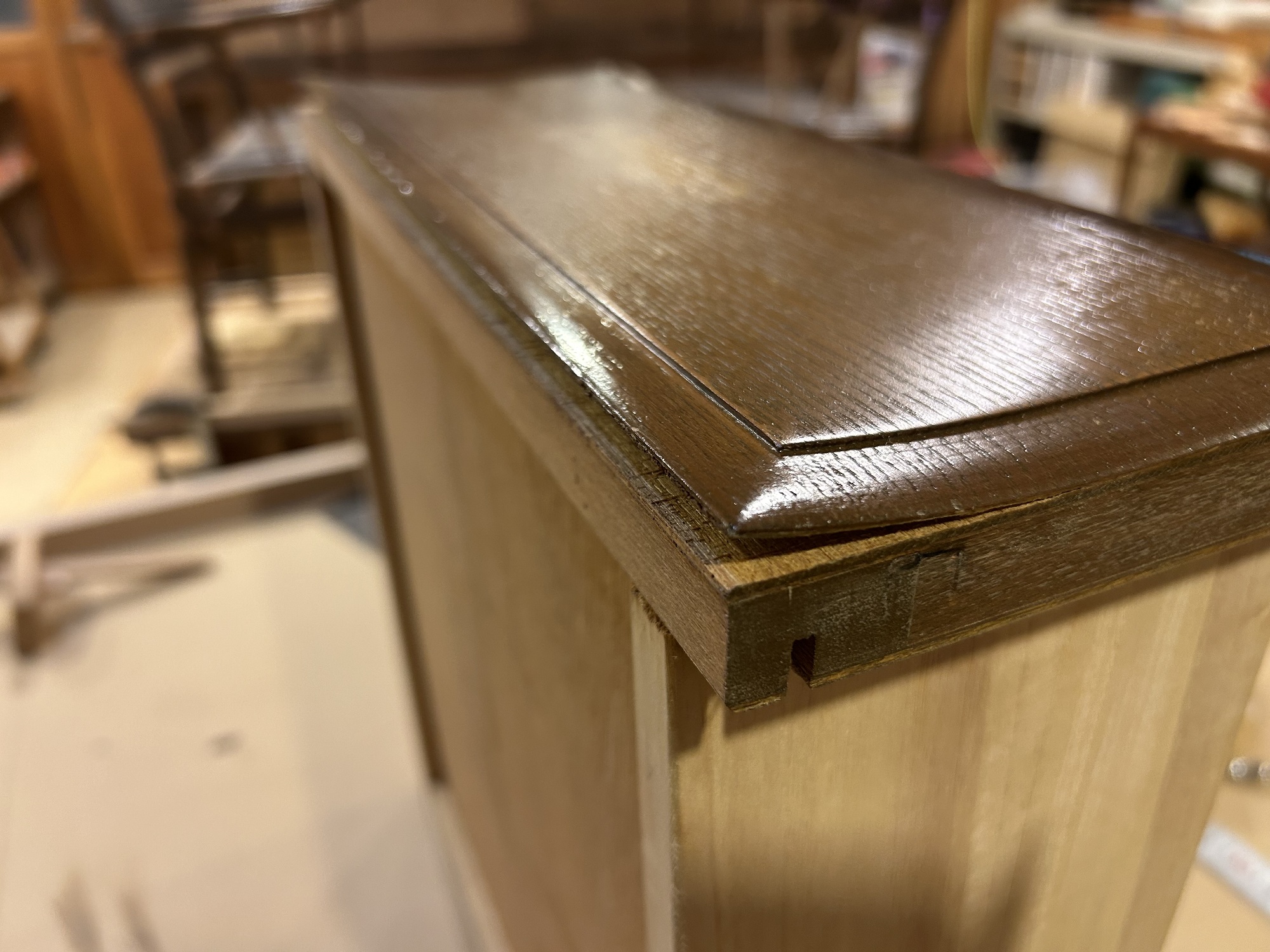 引き出し前板に貼り付けた約5mm厚の前板が反り気味に剥がれていることは、一目でわかりました。
