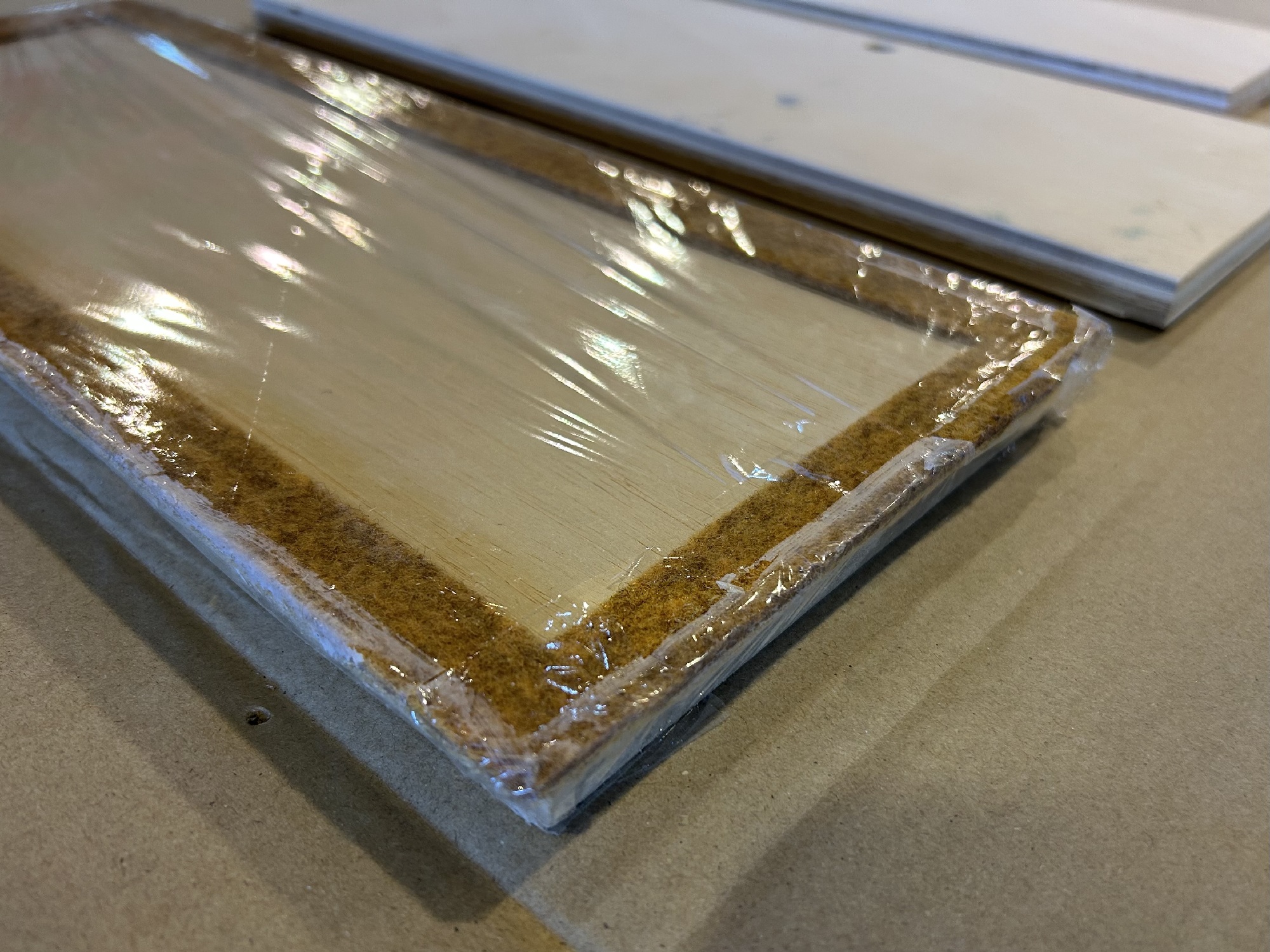 今回の引き出し前板周辺部は、微妙な曲面加工をさせていましたので、合板周辺部にニードルパンチを貼り付けて当て木を作りました。