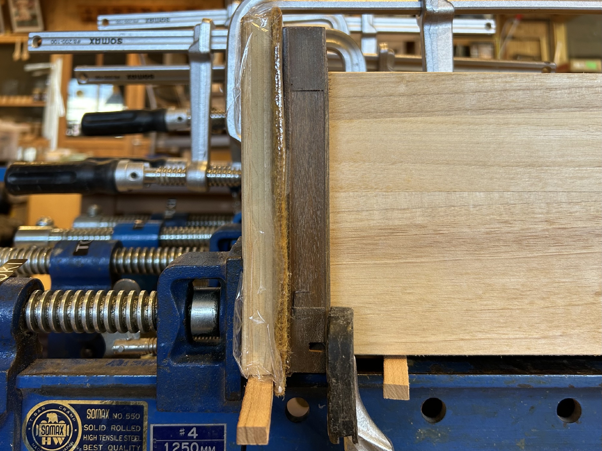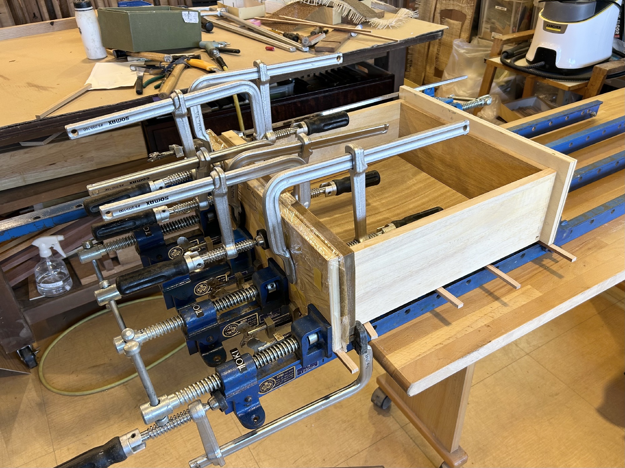 たくさんのクランプ類を使い、前板がキッチリと圧着できたようです。