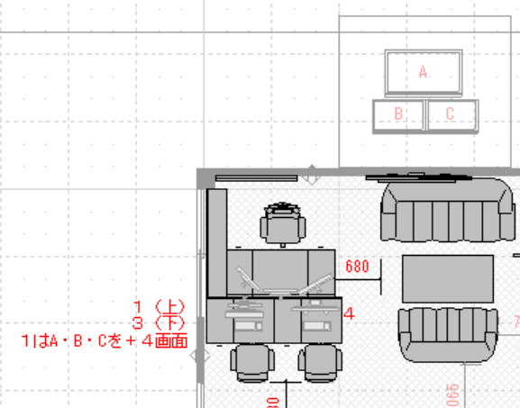 図のA・B・Cのモニターへ左パソコンより投影します。