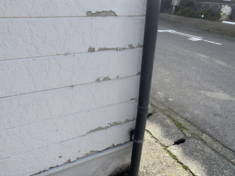 塗装の膨れ、横目地からの割れ、触るとポロポロ崩れる