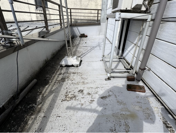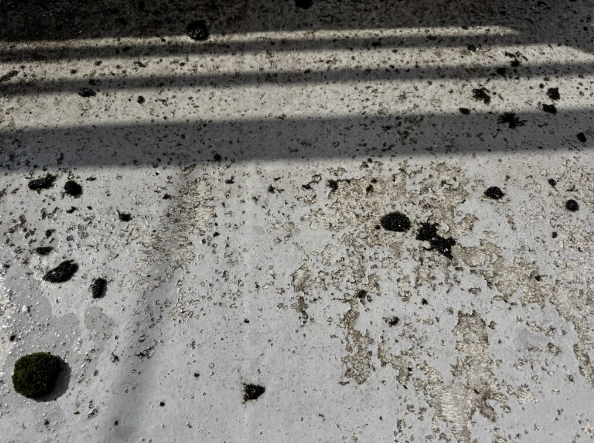上塗りが剥がれてきていて、下のFRP防水樹脂部分が見えだしています。